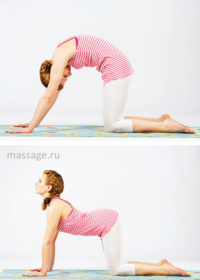 4. После примите позу коровы на выдохе, прогнув спину, поднимая голову и раскрывая грудь.
