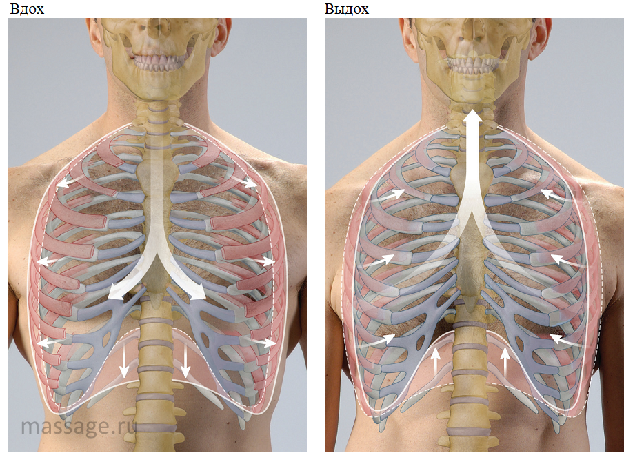 Дыхание – результат трёхмерного изменения формы и объёма одновременно грудной и брюшной полостей. Грудная полость является своего рода ёмкостью для воздуха, способной изменять объём. При попеременном уменьшении и увеличении объёма грудной полости создаётся разница в давлении, благодаря которой воздух сначала поступает в дыхательные пути, а на выдохе выходит наружу. Эта полость, подобно кузнечным мехам, расширяясь, засасывает в дыхательные пути воздух, а сжимаясь, выталкивает его.