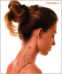 - Выполните надавливания пальцами вдоль линий А и В, проходя их вверх и вниз несколько раз. После каждого надавливания мягко потяните мышцу шеи по направлению к шейным позвонкам, продолжая надавливание (рис. 1). Поменяйте руку и повторите воздействие на другой стороне.