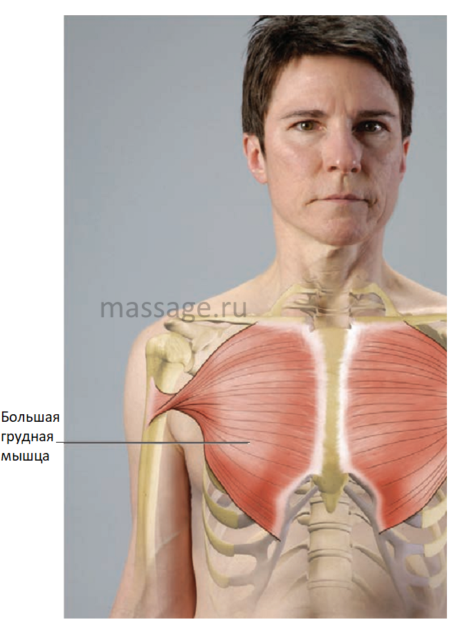 Большая грудная мышца – это крупная поверхностная мышца груди, занимающая область от ключицы до живота. Волокна этой мышцы сложной сетью проходят центрально от рёберных хрящей, грудины и ключицы и сходятся в толстый мышечный пучок у проксимальной части плечевой кости. Перед тем как прикрепиться к плечевой кости, волокна большой грудной мышцы сгибаются и скручиваются, образуя толстую переднюю грань подмышечной впадины. Место крепления этой мышцы покрыто толстыми волокнами переднего пучка дельтовидной мышцы – именно поэтому эту часть большой грудной мышцы довольно сложно пальпировать, и в ней часто развиваются мышечные спайки и перенапряжение.