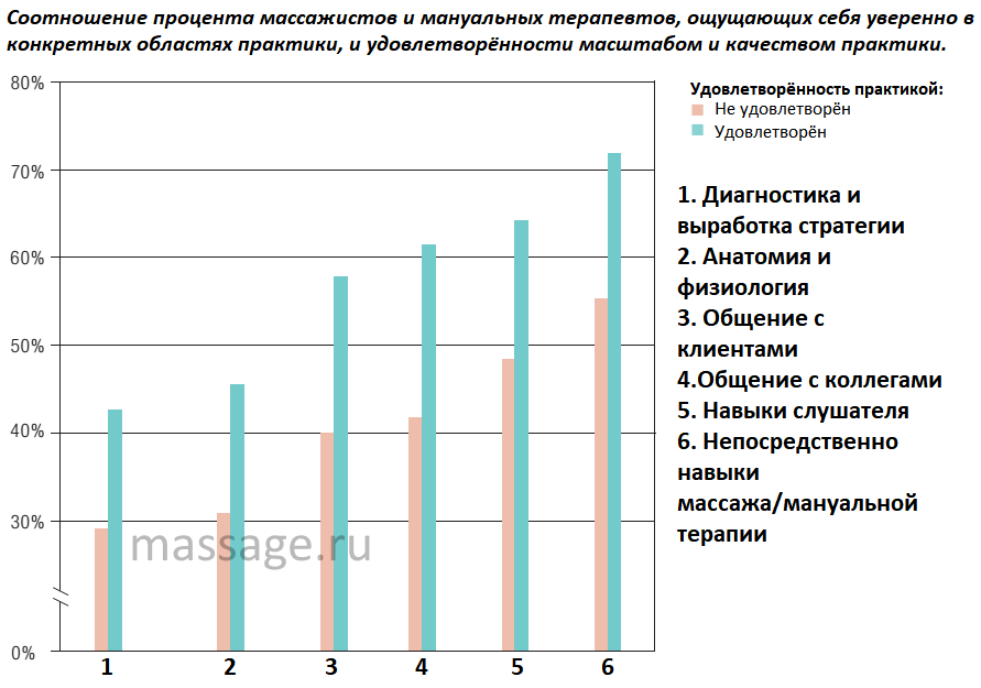 Анализ полученной информации принёс нам немало сюрпризов относительно того, что коррелирует с чувством удовлетворённости своей практикой, а что нет. Удивительно, но наиважнейшим фактором оказалась уверенность в собственном профессионализме. Вне зависимости от масштабов практики, все массажисты были куда более уверены в себе, когда дело касалось их основных умений – непосредственно массаж и диалог с клиентом, чем при оценке их знаний анатомии и медицинской диагностики.