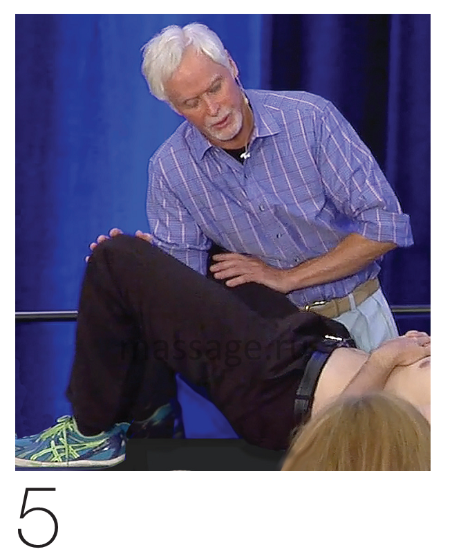 Например, если сгибание или приведение бедра вызывает боль из-за фемороацетабулярного импинджмент-синдрома тазобедренного сустава, начните со снятия сдавления с бедра (Рис.3) и произведите дистракцию, выполнив приведение (Рис.4). Чтобы восстановить нормальное положение и баланс таза, попросите клиента выполнить приведение бедра, пытаясь преодолеть ваше сопротивление и одновременно медленно делая мостик (не гимнастический, то есть без отрыва спины от стола – см. рис. 5). Затем снова проверьте интенсивность болевых ощущений. Для выполнения этих действий клиента необходимо правильно драпировать.