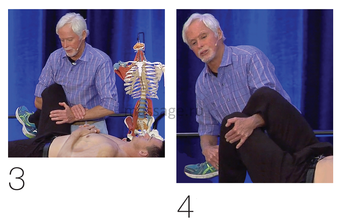 Рис. 4: Ваша левая рука проходит под коленом клиента (нога согнута в колене) и обхватывает другое колено, а вторая рука удерживает лодыжку клиента. Произведите дистракцию, приведение, и аккуратное вращение бедра вовнутрь, осторожно надавливая на лодыжку, поднимая ногу до первого барьера ограничения движения. Клиент сам приподнимает ногу в бедре, пока вы считаете до пяти, и затем расслабляется. Повторите 3-5 раз и снова проверьте подвижность.
