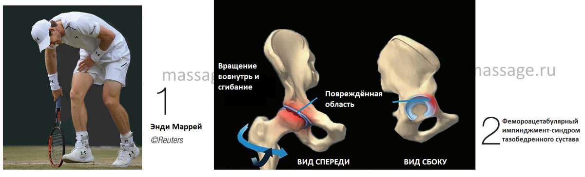 Проблема Маррея заключается в том, что вследствие дегенеративных процессов в суставе повредился суставной хрящ головки правой бедренной кости, что привело к постоянному трению бедренной кости о край вертлужной впадины – это называется «фемороацетабулярный импинджмент-синдром тазобедренного сустава» (Рис.2). Его доктор поставил ему диагноз – остеоартрит тазобедренного сустава, но на данный момент врачи не имеют достаточно доказательств, чтобы утверждать о наличии воспалительного процесса при дегенеративном заболевании суставов, вызванном изнашиванием суставных структур. Именно поэтому я бы назвал его заболевание более подходящим термином – остеоартроз.