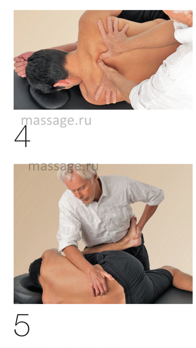 На рис.4 показано, как клиент расположен в согнутом положении, когда терапевт работает со спазмированной областью поперечно-остистых мышц, которые могут мешать верхнему позвонку нормально двигаться относительно нижнего, открываясь. Мои большие пальцы соединены так, как показано на картинке (у позвонка Т7). Я прошу клиента медленно привести подбородок к груди, в это же время пальпируя поперечные отростки с правой стороны. Если я ощущаю, что поперечный отросток уходит кзади, когда клиент приводит подбородок к груди, я применяю длительное давление чуть кпереди и выше – таким образом я воздействую на сухожильный орган Гольджи и расслабляю глубокие мышцы спины. Как только нормальное движение поперечных отростков восстанавливается, я перехожу к позвонку, расположенному выше, и так вплоть до позвонка Т1.