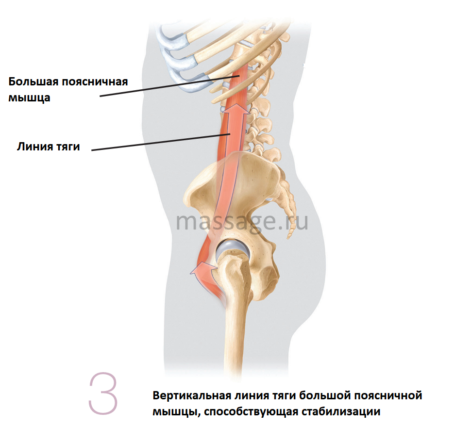 Чем ближе линия тяги мышцы к оси движения сустава, тем стабильнее сустав. Особенно это актуально для множества вертикально ориентированных мышц, расположенных вдоль позвоночника. Легкое сокращение большой поясничной мышцы способствует стабилизации поясничного отдела позвоночника и бедра, бедро, сближая тела позвонков и удерживая головку бедренной кости в суставе (рис. 3).Наибольшее усилие поясничная мышца прилагает к суставу тогда, когда бёдра согнуты под углом 90 градусов. В таком случае эта мышца либо приводит бёдра в ещё более глубокое сгибание, либо разгибает позвоночник в поясничном отделе.