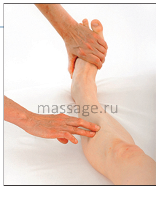 1. Поскольку основное движение передней большеберцовой мышцы – дорсифлексия с инверсией, в первую очередь необходимо пассивно привести лодыжку в это положение. Попросите своего клиента сопротивляться движению. В это же время осторожно уводите лодыжку в противоположном направлении – в плантарфлексию и эверсию. Удерживайте лодыжку в таком положении на протяжении нескольких секунд. 2. Попросите клиента расслабиться, отпустите его лодыжку. Затем медленно растяните лодыжку в направлении плантарфлексии и эверсии. Растягивайте до тех пор, пока ваш клиент не почувствует растяжение передней большеберцовой мышцы (постоянно поддерживайте вербальный контакт). На протяжении нескольких секунд удерживайте лодыжку в таком положении, затем отпустите.