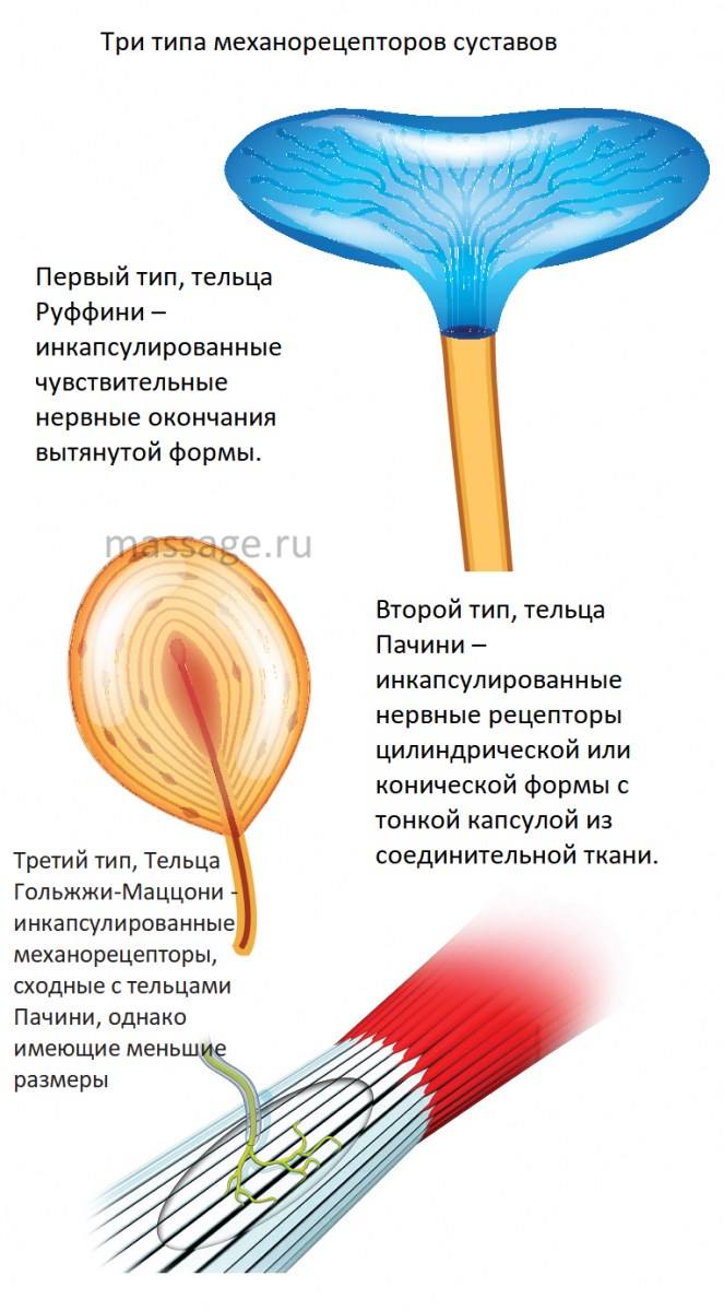 Структурно все типы суставных механорецепторов представляют собой инкапсулированные чувствительные нервные окончания. Когда сустав приходит в движение, форма капсулы изменяется под действием сил давления или напряжения. Представьте, что вы сжимаете резиновый мячик. При изменении формы капсулы находящийся внутри неё нерв посылает информацию о скорости, направлении и характере движения сустава. Представьте, что весь пол под вашими ногами усыпан резиновыми мячиками, и вы наступаете на них в определенной последовательности с заданной скоростью. Сигнал одного механорецептора недостаточно интенсивен, распознать его трудно, однако сообща они передают огромные объёмы проприоцептивной информации.