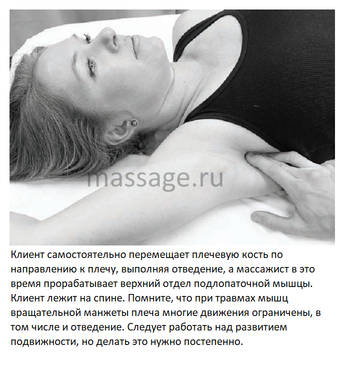 Для работы с триггерными точками и мышечными узлами плечевой сустав должен двигаться как в пассивном, так и в активном диапазоне движений. Активные движения помогут вам проработать глубокие слои мышцы, но начинать следует с пассивных движений. Сначала покажите клиенту, какие движения ему нужно выполнить, а потом позвольте ему сделать это самостоятельно.
