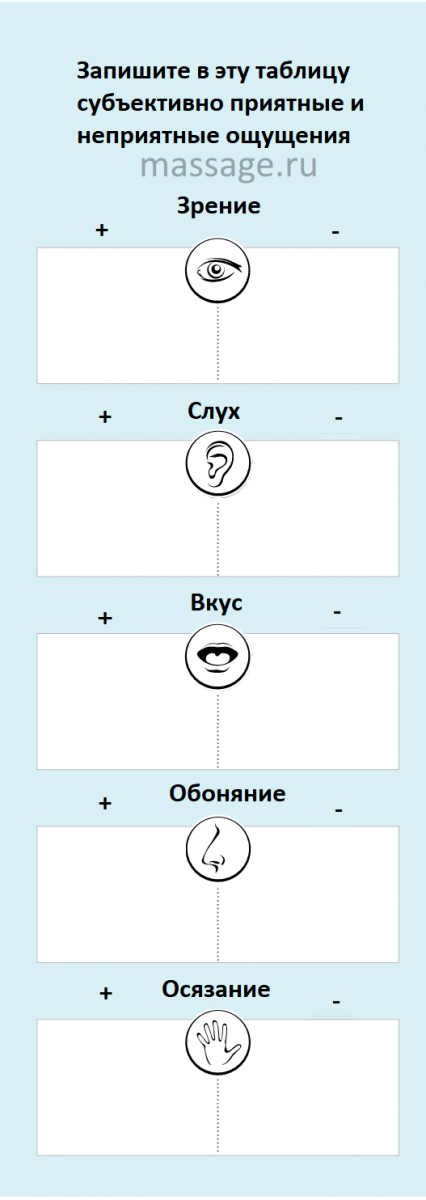 Повторите эти вопросы, рассуждая о каждом своём ощущении. Сначала подумайте, какая чувственная информация даёт вам ощущение здоровья, счастья и умиротворения, а какая вызывает стресс, злость, агрессию и беспокойство. Это упражнение прекрасно тем, что оно отлично повышает степень самосознания – вы начнёте машинально переключаться только на полезные для вашего тела и духа активности и быстро избавитесь от вредных и лишних в вашей жизни вещей.