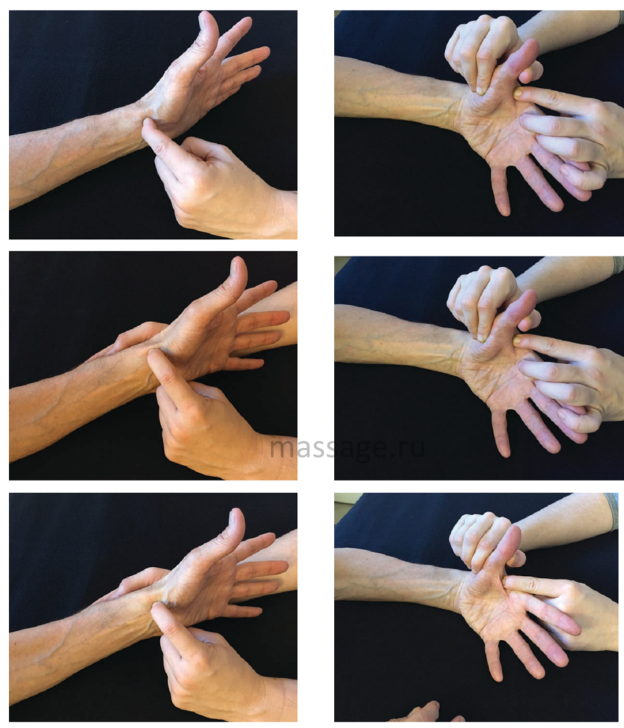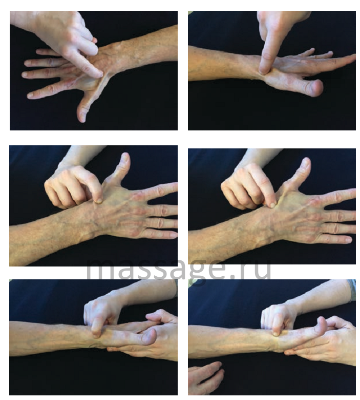 Попросите клиента отвести большой палец, чтобы определить месторасположение сухожилия. Оно расположено слегка антериально и сзади относительно сухожилия короткого разгибателя большого пальца кисти. Попросите клиента покачать большим пальцем из стороны в сторону, чтобы вы смогли разделить сухожилие длинной мышцы, отводящей большой палец кисти, и сухожилие короткого разгибателя большого пальца кисти. Они расположены очень близко, поэтому, чтобы найти сухожилие отводящей мышцы, следует приложить небольшое усилие. Как только вы определили месторасположение сухожилия, пальпируйте его, чтобы точно определить повреждённую область или области. Основной признак повреждения – локальные болевые ощущения. Как только вы обнаружили повреждённые места, попросите клиента расслабить большой палец и приступайте к терапии.