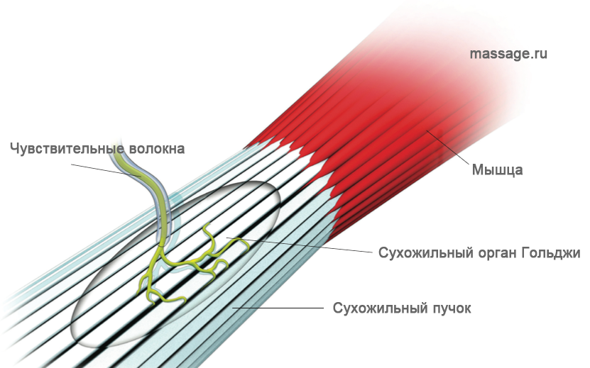 Там, где мышечные веретена контролируют скорость изменения длины мышцы, органы сухожилия Гольджи следят за изменениями мышечного напряжения. Напряжение мышц возникает, когда мышцы удлиняются и резко растягиваются. Кроме того, напряжение возникает при изометрических или изотонических сокращениях мышц. По мере увеличения напряжения мышц, чувствительные концы афферентного нерва сжимаются. Это сжатие инициирует связь с центральной нервной системой, и органы Гольджи передают информацию о величине напряжённости, возникающей в мышцах.