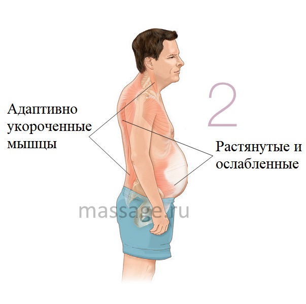 2.Адаптивное укорачивание мышц с одной стороны тела вызывает адаптивное удлинение мышц с другой стороны. Со временем удлинённые мышцы слабеют вследствие постоянной работы в механически невыгодном растянутом положении (Рис.2).