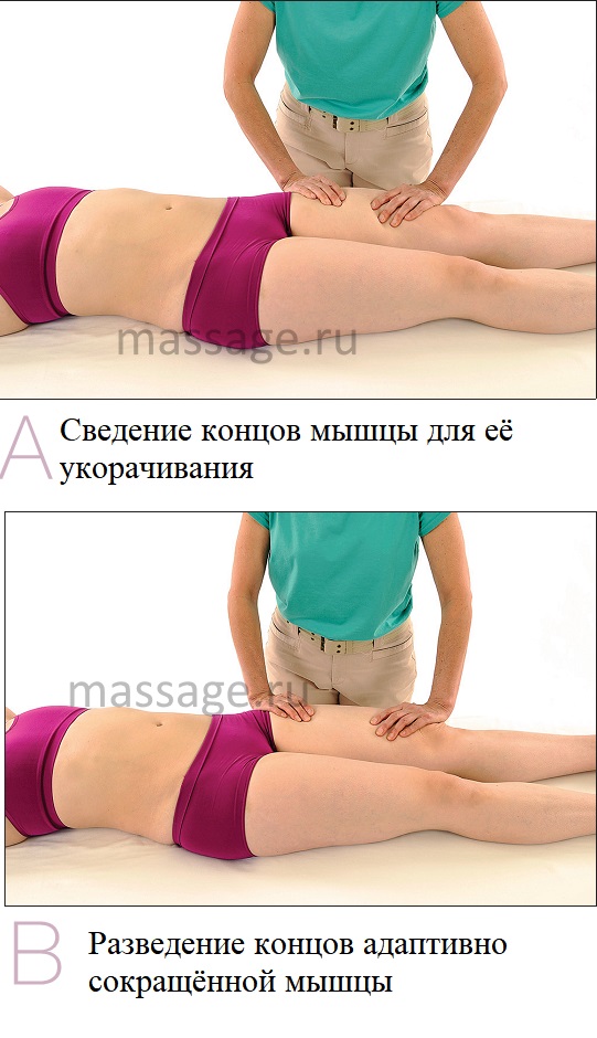 • При работе с адаптивно укороченной мышцей после сокращения отпустите её, медленно разведите концы мышцы, удлиняя её до предела диапазона растяжения (Рис.В)