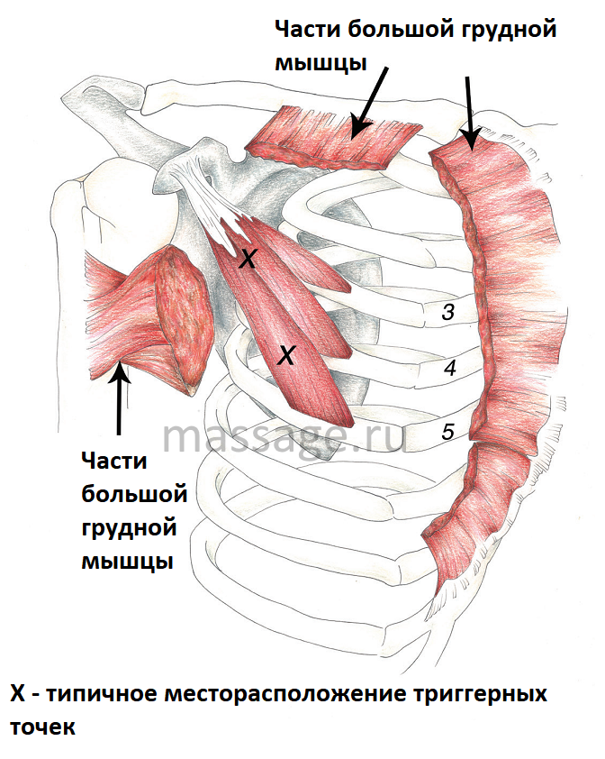 Представьте себе три длинных пучка мышечных волокон, идущих по диагонали книзу и медиально от клювовидного отростка к 3-5 рёбрам (у некоторых людей эти мышечные пучки крепятся к 4 и 6 рёбрам). У этих мышц-стабилизаторов очень много функций: они соединяют плечевой пояс (лопатку и ключицу) с грудной клеткой. Перенапряжённая малая грудная мышца зачастую тянет клювовидный отросток по направлению к рёбрам (вне зависимости, необходимо это или нет), что приводит к развитию множества мышечно-фасциальных и биомеханических нарушений.