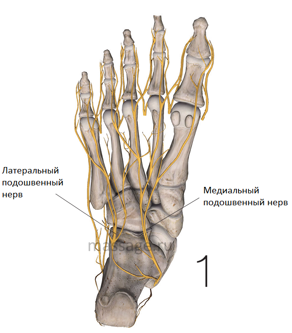 получали именно подошвенные пальцевые нервы, которые, будучи защемленными или повреждёнными, при приложении давления ответят возникновением характерных симптомов.