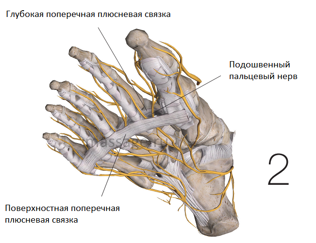 Исследование путей прохождения подошвенных пальцевых нервов дало возможность понять, почему при развитии данного заболевания они подвержены компрессии между головками плюсневых костей. Головки плюсневых костей связаны вместе глубокими и поверхностными поперечными плюсневыми связками, благодаря чему образуется небольшое отверстие, туннель между ними. Подошвенные пальцевые нервы проходят через эти узкие туннели между головками (Рис.2). Для подошвенных пальцевых нервов проход между поверхностными и глубокими поперечными плюсневыми связками довольно узок. В то же время эти нервы должны пройти между головками, что сужает туннель ещё сильнее.
