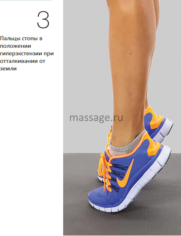 Биомеханика перемещения стопы также играет значительную роль в развитии компрессии пальцевого нерва. При фазе отталкивания цикла ходьбы происходит гиперэкстензия плюснефаланговых суставов (Рис.3). При гиперэкстензии пальцев стопы подошвенные пальцевые нервы сильно растягиваются. Данное положение стопы увеличивает нагрузку на нерв, особенно если он уже защемлен смежными структурами. Как результат, клиенты часто жалуются на усиление болевых ощущений именно при разгибании в фазе отталкивания.