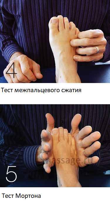 В дополнение к диагностике специфических клинических симптомов, которые могут указать на защемление пальцевого нерва, существуют также особые тесты, способствующие выявлению защемления данных нервов. Поскольку этот нерв залегает глубоко в стопе и расположен прямо между головками плюсневых костей, невозможно с помощью поверхностной пальпации индуцировать симптомы. Следующие специфические тесты разработаны таким образом, чтобы в ходе их проведения большую нагрузку