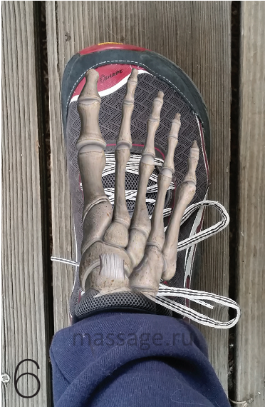 В первую очередь стоит настоятельно порекомендовать клиенту сменить обувь, избегая ношения обуви с узкой передней частью, дабы дать стопе возможность принять своё физиологическое положение. Некоторые производители обуви прекрасно осведомлены об этой проблеме, например, на рис.6 представлены кроссовки Altra. На рисунке прекрасно видно, что стопа в них принимает физиологическое положение. Увеличение переднего отдела обуви не только снижает степень сдавливания головок плюсневых костей, но и даёт возможность комфортно носить ортопедические стельки.