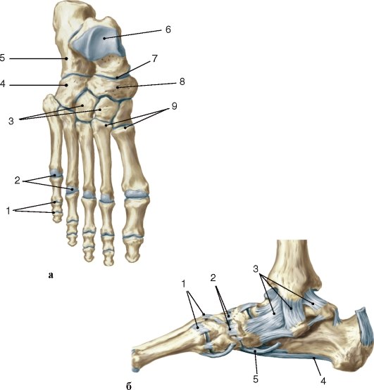 а - вид стопы сверху: 1 - межфаланговые суставы; 2 - плюснефаланговые суставы; 3 - клиновидные кости предплюсны; 4 - кубовидная кость; 5 - пяточная кость; 6 - таранная кость с блоком - суставной поверхностью голеностопного сустава; 7 - поперечный сустав предплюсны; 8 - ладьевидная кость; 9 - предплюсне-плюсневые суставы;