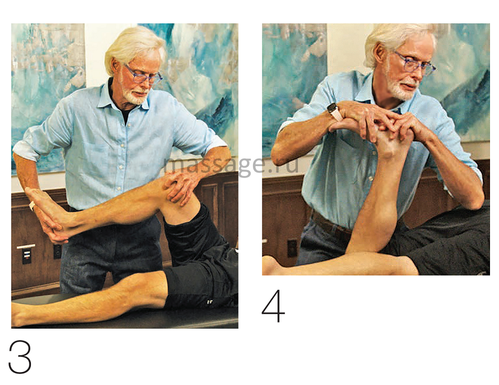 Модифицированный тест МакМюррея – это тест на провокацию болевых ощущений, помогающий определить, какой именно мениск поврежден – медиальный или латеральный. Данный тест продемонстрирован на рис.3: нога клиента согнута под углом в 90 градусов в бедре и колене, левый большой палец массажиста в это время сдавливает латеральный мениск, а указательный палец сдавливает медиальный мениск у линии бедренно- большеберцового сустава. Если по мере того, как массажист руками медленно перемещает большеберцовую кость из положения отведения и вращения наружу в положение приведения и вращения внутрь (вальгус коленного сустава), клиент ощущает дискомфорт или шелчки вдоль границы латерального мениска, тест МакМюррея на эту сторону (латеральный мениск) можно считать положительным. В свою очередь, если боль возникает при перемещении колена в положение отведения и вращения наружу (варус коленного сустава), и клиент замечает дискомфорт или щелчки с боковой стороны, вероятно повреждение медиального мениска.