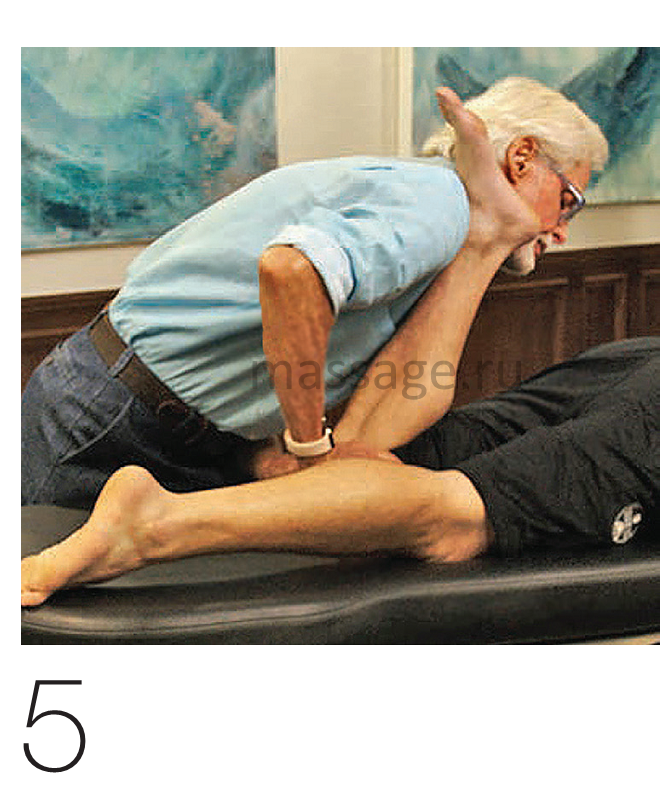 Этот тест показан на рис.4. Клиент лежит лицом вниз. Положительный результат теста – боль, локализующаяся глубоко или боль по линии сустава, когда массажист вращает большеберцовую кость клиента внутрь и наружу, прикладывая давление средней интенсивности. Если клиент отмечает дискомфорт или боль при вращении этой кости внутрь, тест на повреждение медиального мениска можно считать положительным. С латеральным – всё наоборот.