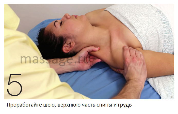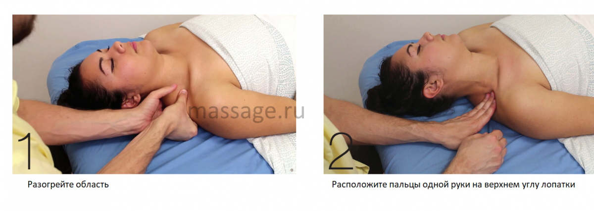 Попросите клиента лечь на спину, сами сядьте у изголовья массажного стола, лицом к стороне шеи, с которой вы собираетесь работать. Медленно и аккуратно разогрейте шею и плечи. Будьте осторожны – голова и шея клиента должны двигаться по мере возможности, так, чтобы ему или ей было комфортно.