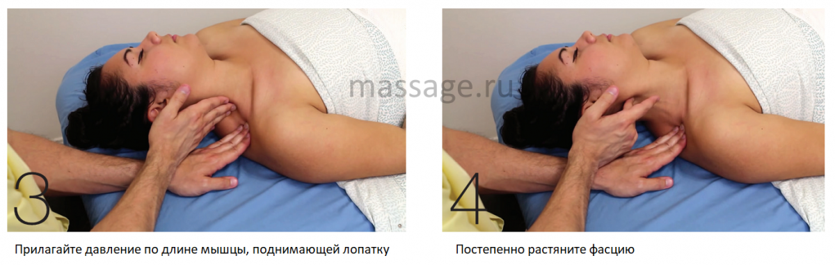 Как вы могли заметить, эта техника имеет много общего с миофасциальной растяжкой, о которой мы говорили в апреле (https://massage.ru/articles/miofascialnaya-rastyazhka-uchimsya-myslit-sh...). Мы прижимаем фасцию, расположенную у места сухожильного крепления мышцы, поднимающей лопатку, а затем прилагаем давление в разных точках по длине мышцы, аккуратно растягивая фасцию, не вызывая чрезмерного напряжения в мышце. Один из важнейших полезных эффектов такой растяжки заключается в том, что мы убеждаем ЦНС клиента, что шею можно безболезненно растянуть.