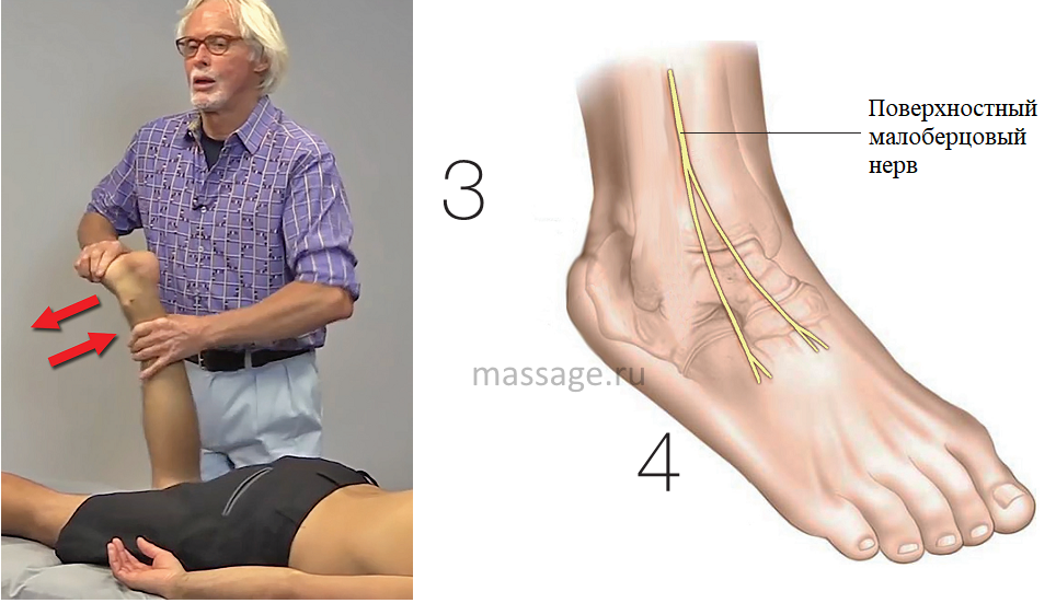 Этот приём отлично подходит для восстановления мобильности таранно-пяточного сустава. Однако когда я подошёл к клиенту с другой стороны стола, чтобы проделать то же самое действие, только под другим углом, случилось нечто, что я не смог предугадать. Когда я сжал ткани, расположенные у поверхностного малоберцового нерва на переднелатеральной поверхности лодыжки, клиент буквально взвыл от боли. (Рис.4).