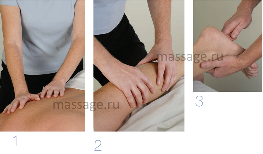 Теперь приступайте к работе с одной ногой. Используя обе руки, разминайте мышцы верхней и нижней части ноги (т.е. используйте приём под названием разминание) (Рис.2). Теперь обратите своё внимание на то, как вы используете пальцы ваших рук. Расслаблены ли они, когда вы разминаете мышцы? Расслаблены ли мышцы предплечья? Не чувствуете ли вы напряжения в запястьях? Затем накройте ногу партнёра и отдохните.