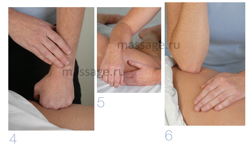 Сейчас вы можете попросить партнера изменить положение таким образом, чтобы вы смогли приложить глубокое давление с помощью локтя (Рис.6). Пальпируйте ткани, затем приложите давление, стоя прямо над зоной, с которой вы работаете, или же вы можете сделать это под углом. Используйте другую руку, чтобы направлять движение локтя, спрашивая у своего партнера, насколько ему комфортно.