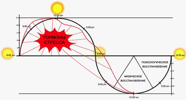 После заката наше тело начинает вырабатывать другие гормоны: гормоны роста и мелатонин! Тело начинает процесс восстановления. Если Вы не ложитесь спать до 22:30, Вы нарушаете цикл восстановления своего организма. Поэтому Вы просыпаетесь «разбитым». Ощущая стресс и напряжение, накопившееся за предыдущий день!