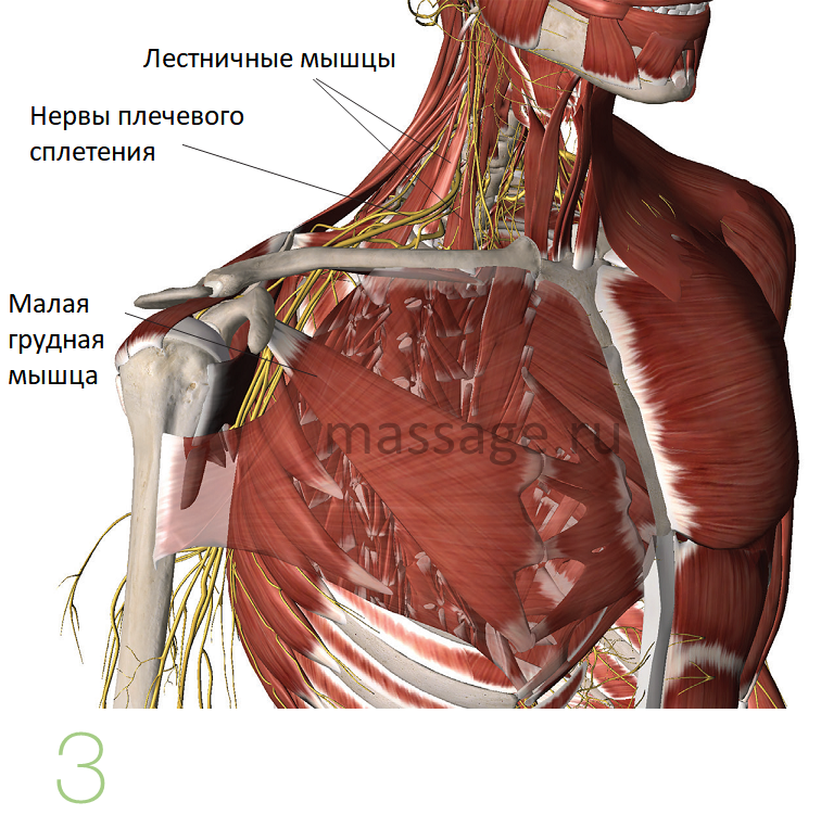 С помощью глубоких поглаживаний также можно проработать мышцы шеи передней и боковой группы – они тоже могут воздействовать на нервы плечевого нервного сплетения. Особое внимание следует уделить передним и средним лестничным мышцам, потому что именно их перенапряжение может привести к сдавлению нервов плечевого сплетения в области шеи (Рис.3).