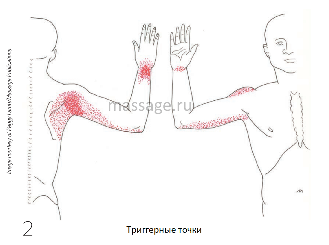 Профессиональный подход к подлопаточной мышце необходим при работе с клиентом, восстанавливающимися после травмы мышц-вращателей плеча. Триггерные точки, появляющиеся вследствие определённых проблем с этой мышцей, могут располагаться в области лопаток, плеча, рук и даже запястий (Рис.2).