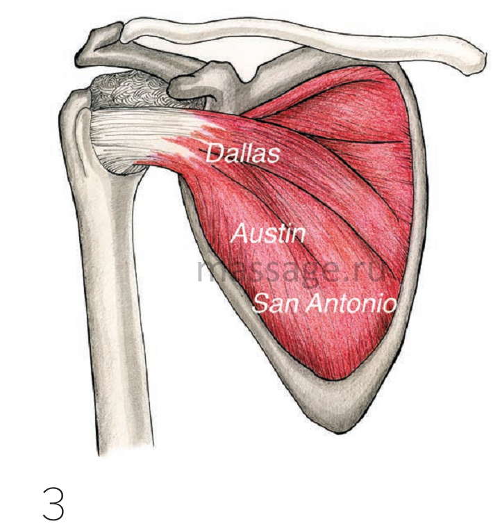 Сейчас я попробую провести аналогию. Я живу в Остине, в центральной части штата Техас. Даллас располагаются к северу, Сан-Антонио – к югу. Если я попробую подойти к подлопаточной мышце со стороны Сан-Антонио (Юг), то я с большой вероятностью приму широчайшую мышцу спины за подлопаточную мышцу (Рис.4). Если я зайду со стороны Далласа (север), я, вероятно, обнаружу сухожилие и это хорошо – с этого места мы и должны начать (Рис.3).
