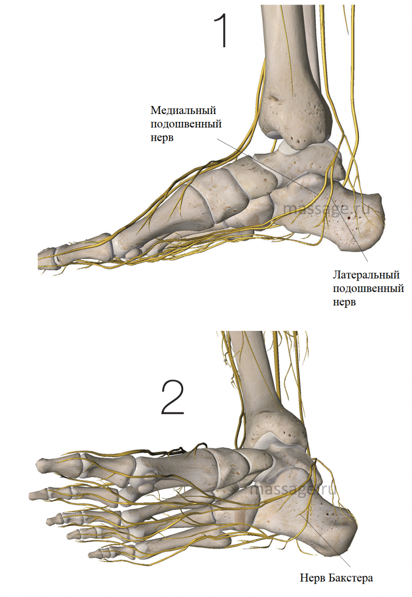 Большеберцовый нерв разделяется на две основные ветви – медиальный и латеральный подошвенные нервы, проходя по медиальной стороне лодыжки в тарзальном канале (Рис.1). Обе ветви затем огибают медиальную лодыжку и проходят по нижней поверхности стопы. Первая ветвь, меньшая по размеру, отходящая от латерального подошвенного нерва, и есть нерв Бакстера (Рис.2).