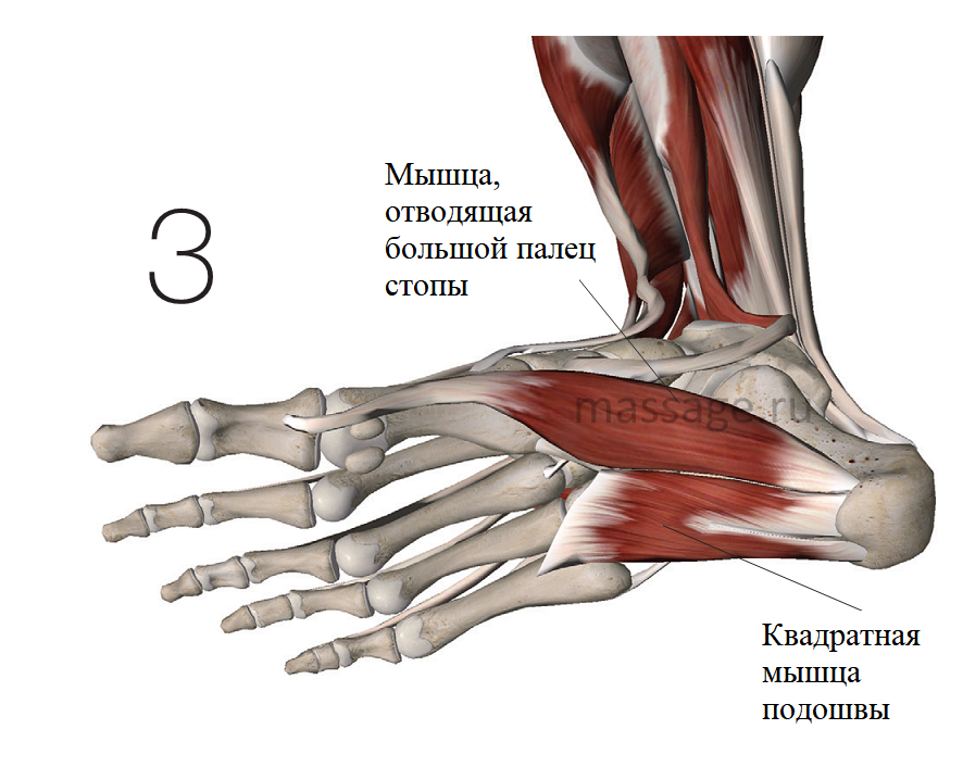 При нейропатии Бакстера возможны два потенциальных места защемления этого нерва. В первую очередь, нерв Бакстера может быть защемлён между глубокой фасцией мышцы, отводящей большой палец стопы, и квадратной мышцей подошвы (Рис.3).