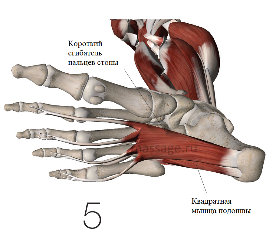 При компрессии двигательных волокон чаще всего страдает мышца, отводящая мизинец, хотя нерв Бакстера в некоторых случаях может также иннервировать короткий сгибатель пальцев и квадратную мышцу подошвы (Рис.5).
