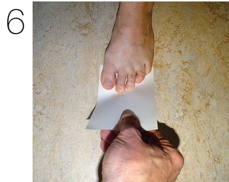 Чтобы провести этот тест, положите на пол небольшой, но плотный лист бумаги или картона. Попросите пациента попытаться прижать лист как можно сильнее к полу, и попытайтесь медленно вытащить лист из-под пальцев. (Рис.6) Если пациент не способен удержать лист или если вы обнаружили, что из-под пальцев одной стопы вытаскивать лист легче, чем из-под другой, это свидетельствует о слабости короткого сгибателя пальцев стопы. Это указывает на потенциальную компрессию нерва Бакстера.