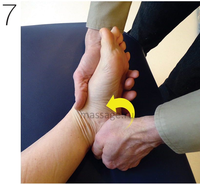Работу следует начать, поместив стопу в положение инверсии. Свидетельством эффективности вашей терапии станет ослабление болевых ощущений. Экспериментируйте, чтобы понять, при каком положении стопы клиент чувствует себя лучше всего.