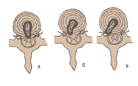 Затем начинает развиваться выпячивание фиброзного кольца в просвет позвоночного канала, появляются его радиальные трещины. Мякотное ядро начинает постепенно внедряться в одну из наиболее выраженных трещин, а затем выпадает в просвет позвоночного канала через образовавшееся отверстие в фиброзном кольце. Образуется грыжа диска, которая сдавливает спинной мозг (рис. 2а), спинной мозг и корешок (рис. 2б), или только корешок (рис. 2в). Клинически выпадение мякотного ядра проявляется резко выраженными пояснично-крестцовыми болями. Грыжа диска может являться также следствием травмы.