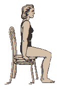 На 12-14-й день после операции больной обучается вставанию и ходьбе с двумя костылями. Садиться больному разрешается в среднем через 4 недели – на 28-й день. Вначале допускается сидение на стуле с жестким сидением, с выпрямленной спиной, не прислоняясь к спинке, ноги согнуты в коленях под прямым углом, стопы упираются в пол. Для разгрузки позвоночника больной опирается руками о сидение стула (рис.3).