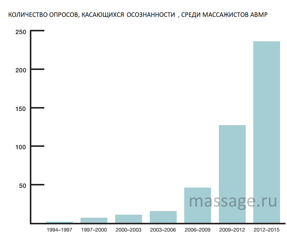 Многие мануальные терапевты и массажисты знакомы с понятием «осознанность» и знают, в чём его ценность. Американская ассоциация массажистов и мануальных терапевтов (ABMP) задала своим членам один вопрос: «Большую ли роль играет осознанность в нашей работе?». 98,5 процентов ответили утвердительно, 1,5 процента были не уверены, Но никто не ответил отрицательно. Большое число программ обучения массажистов и мануальных терапевтов используют в своём курсе понятие осознанности или родственные ему понятия – «терапевтическое присутствие», «сосредоточение терапевтического внимания». Множество подходов используют это понятие в своей системе. Например, метод Фельденкрайза, метод Александера, Розен-метод и Хакоми-терапия.