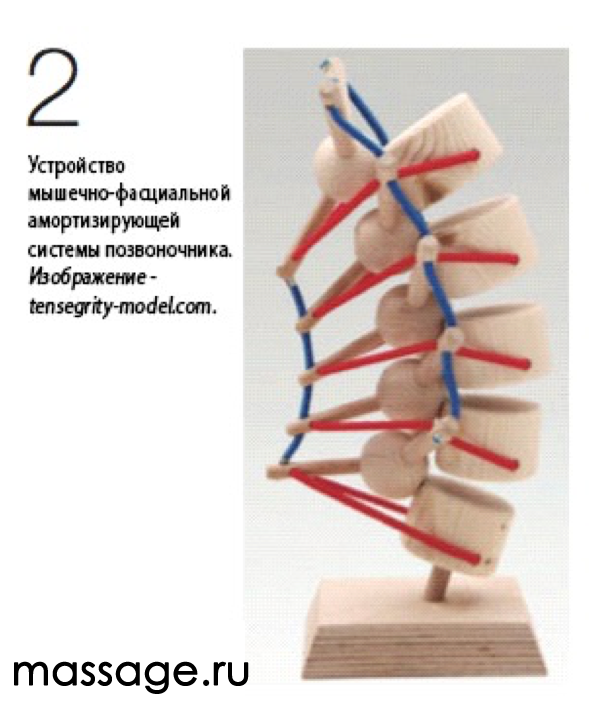 Вопреки расхожему мнению, межпозвонковые диски не являются основными амортизаторами позвоночника. Эту роль играет чрезвычайно сложно устроенная мышечно-фасциальная амортизирующая система. На рис.2 видно, как гибкие нити красного и синего цвета, изображающие мышцы и связки, образуют тенсегрити – конструкцию, работающую одновременно на сжатие и растяжение. В норме эти ткани обеспечивают разделение позвонков даже при отсутствии межпозвонковых дисков. Принимая во внимание эти факты, мы задаемся вопросом: если восстановление функции мышц, служащих для преодоления гравитации, является ключом к замедлению старения межпозвоночных дисков, каким образом лучше всего восстановить питание поврежденных дисков и улучшить их состояние?