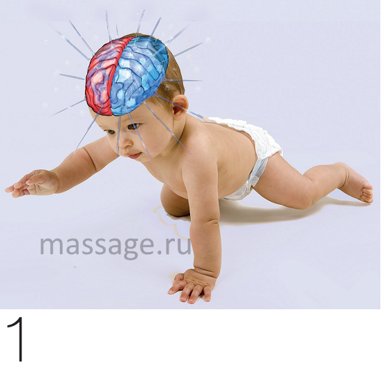 На протяжении этого первичного этапа развития правое полушарие головного мозга ребёнка контролирует правую сторону тела, а левое полушарие контролирует левую. Ребёнок передвигается, используя нескоординированные движения такого рода вплоть до следующей стадии развития, когда он переходит к перекрёстному ползанию (одновременно с правой рукой выдвигается левая нога, а с левой рукой – правая нога). Этот новый контралатеральный паттерн движений реорганизует центральную нервную систему ребёнка, объединяя все системы его организма в одно целое (Рис.1). (Перекрёстное ползание способствует организации нервно системы ребёнка).