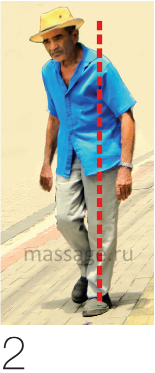 При оценке походки такого клиента можно заметить, что его плечевой пояс и таз производят вращение как единое целое. На рис.2 показано, как гомолатеральный паттерн ходьбы вынуждает человека наклонять голову вправо, когда он переносит вес тела на левую ногу. Может показаться, что он всегда ходит боком. Подобное несбалансированное положение не только нарушает его угол обзора, но и приводит к значительно большим затратам энергии на ходьбу. Кроме того, неправильное положение глаз при ходьбе активирует установочные или выпрямляющие рефлексы, что является стрессом для всего организма и приводит к цервикогенному головокружению.