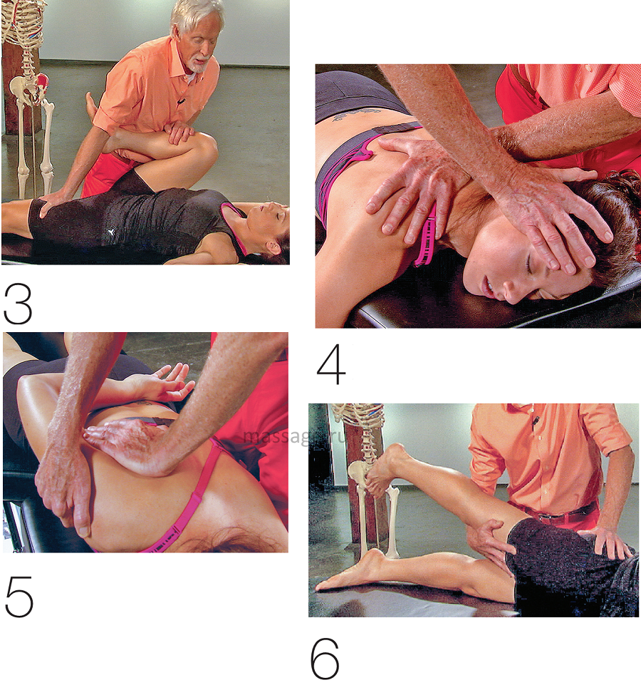 Сохранять баланс гораздо проще, когда голова вертикально выравнена относительно стоп, а глаза смотрят ровно вперёд. Подобное положение головы и шеи позволяют силам гравитации проходить без особых усилий через тело. Перед тем, как предлагать клиенту упражнение на развитие контралатерального паттерна движений, которое будет описано ниже, терапевт должен убедиться, что у клиента нет проблем с кинетическими цепями и шея, грудная клетка, поясница и таз способны к симметричному наклону вбок и вращению, так как это необходимо для контралатеральной походки. На рис.3-5 изображены техники, которые помогают справиться с компенсаторными спазмами, встречающимися у многих клиентов с гомолатеральной походкой.