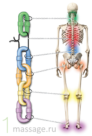 Почему сейчас эта информация преподносится как нечто инновационное? Всё просто – это связано с популяризацией понятия «кинетическая цепь». Сейчас терапевты, применяя это понятие, заново исследуют, каким образом ограничение подвижности в одной зоне негативно влияет на функционирование прилегающих тканей, и как нейромиоскелетная система распределяет избыточную нагрузку с помощью кинетических цепей (Рис.1).