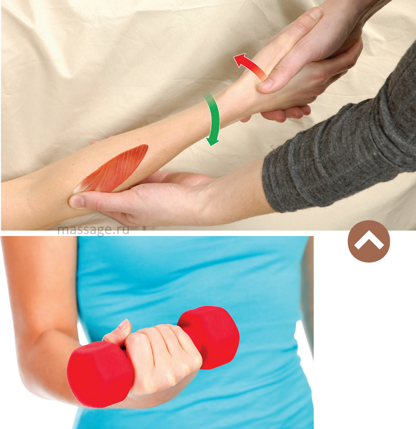1. Пассивно согните руку в локте и произведите супинацию предплечья, чтобы расслабить мышцы.